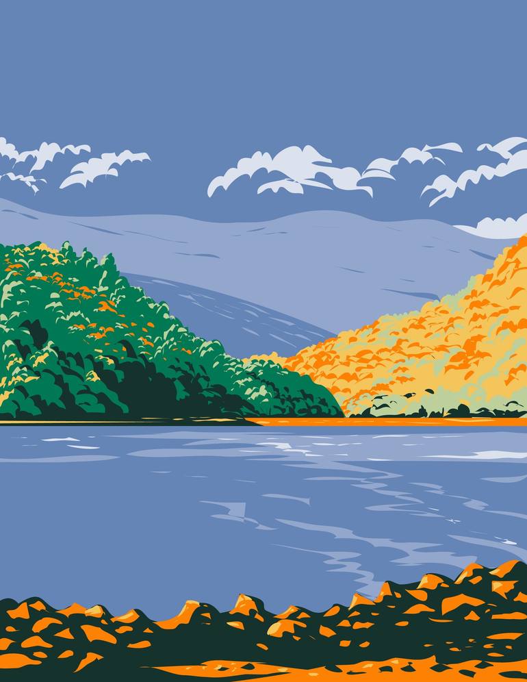 WPA poster art of Cove Lake State Park around the impoundment of Cove Creek in Campbell County, Tennessee United States of America USA done in works project administration style.