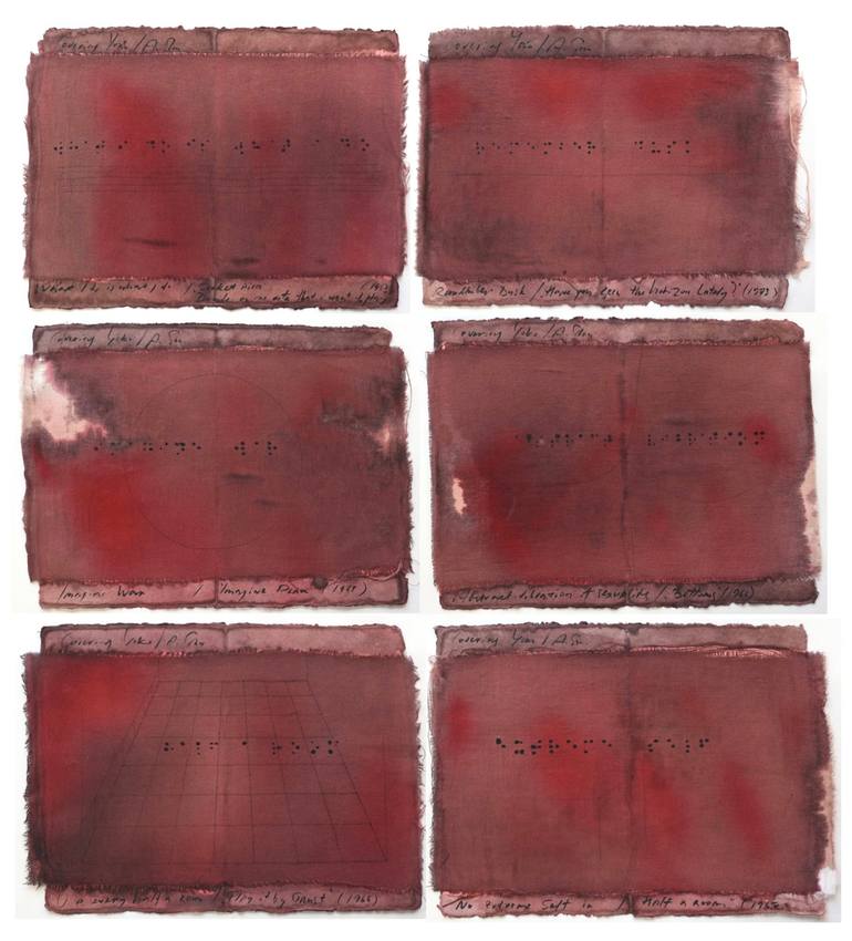 Cover on 6 art works of Yoko Ono: Imagine peace (1969) / "Imagine war" Have you seen the horizon lately? (1973) / "Remember dusk" Half a room (1967) / "No extreme self in" Play it by trust (1966) / "You are every half a room" Bottoms (1966) / "Abstract vibration of sexuality" Secret Piece. Decide ...