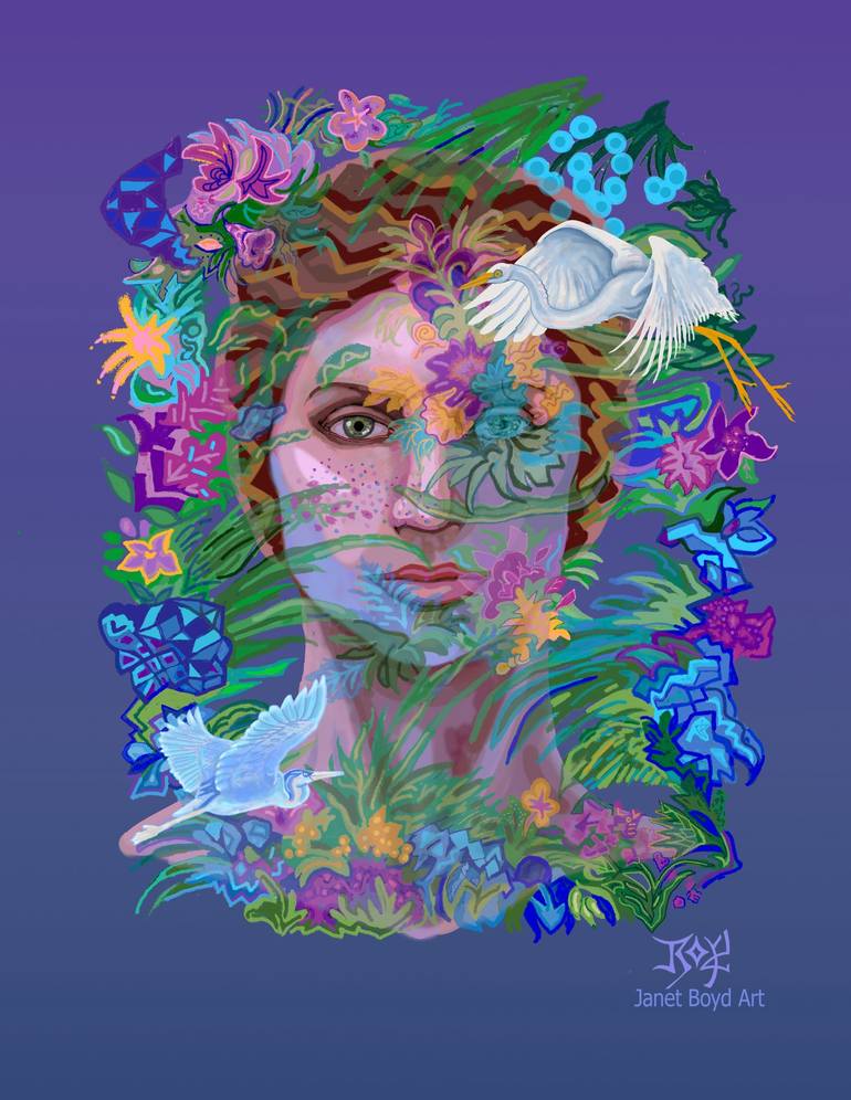 Her head is in the clouds, but you can tell by her intense eyes that she is not an air head. Desirey's companions are egrets. They guide and protect her. They are her guardian angels. The flowers are rich in color, blue, yellow, reds, green. This is a dreamy picture. There is a balance of calm and...