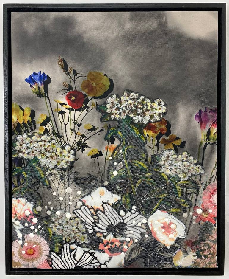 This is a moody garden at dusk, when the light has waned, but those last rays illuminate the beauty of the flowers. I layered new and repurposed fabrics and stitched them using the free motion embroidery process. Hand dyeing creates close up visual interest. Set in a black floater frame, professiona...