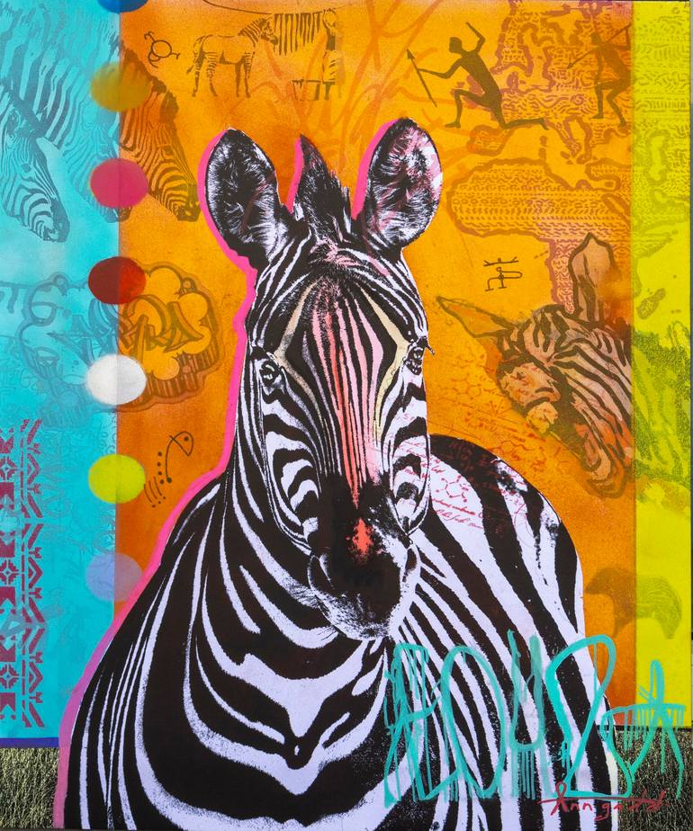 In crafting this piece, I used a photograph I'd Taken in the Etosha National Park, Namibia. I converted it toduotone and then printed it on canvas. Then I used inks to color it. Then the fun started when I took stencils, images of graffiti and Khoisan (bushman) art. Both forms of self-expression. I ...