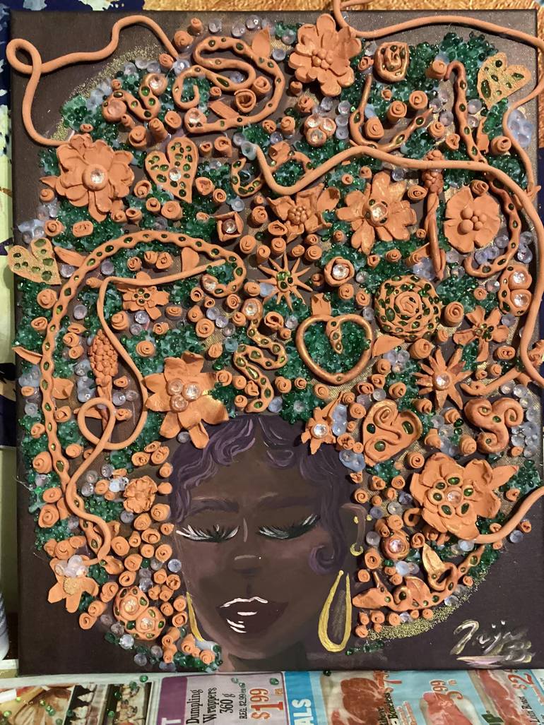 The way this piece was inspired was the materials and really just whatever I was feeling in the moment. The sculpted flowers and vines were suppose to go on a frame, but I decided to make them a part of the completed piece. I added glass details and little diamond 3d shapes , beads, and gold to have...