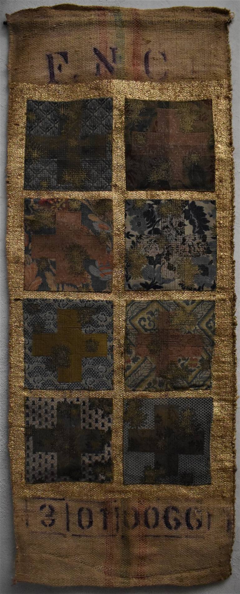 This artwork was created from a series of eight smaller pieces that I wanted to be seen together as one. Each cross has been created from an antique upholstery sample with dense methodical stitching in gold and black threads overlaid across the top of the surface. The main body of the artwork has ...