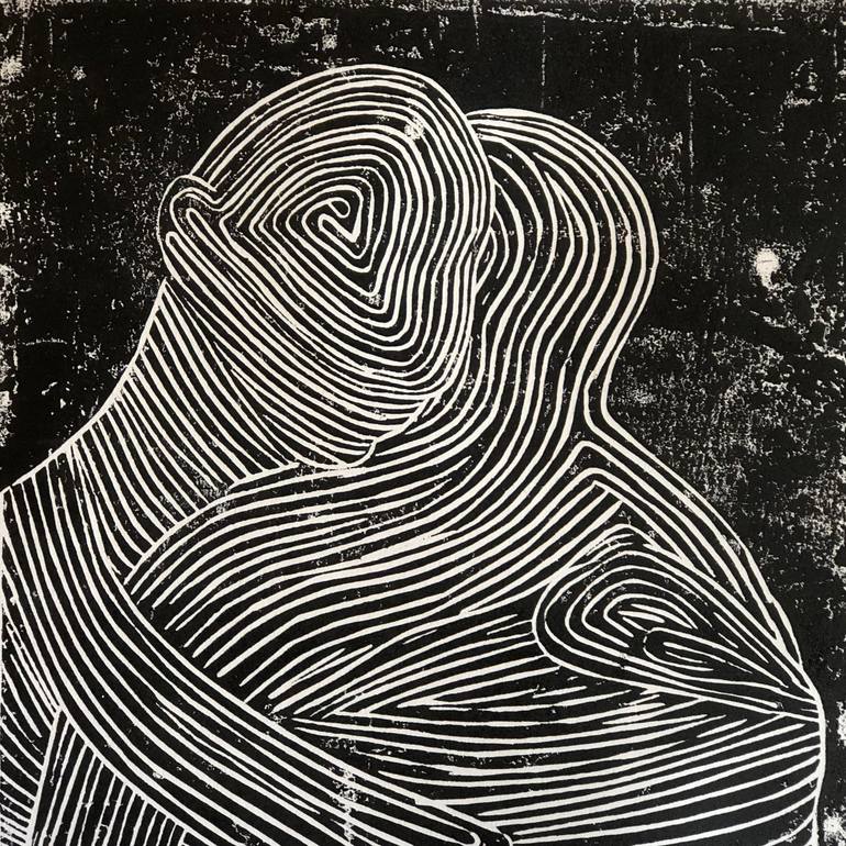 This image is about diverse people embracing. The print is a run of 50 done using woodblock printing and printed onto paper using black printers ink. It runs in my family to love wood. However as the first artist in my family, I was the first to use wood for woodcuts