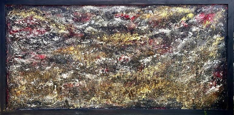 "Ethereal Radiance" is a dazzling abstract painting by Donna Murray, measuring 30 x 60 inches. This masterpiece features a textured surface where gold, silver, and red glitter converge in harmonious chaos, radiating depth and movement. The bold 2-inch black frame complements the vibrant hues, adding...