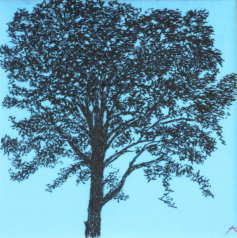 Embroidered image of black cotton yarn on striking blue silk, depicting the very tall maple tree that I see in the evening light. This painting has a partner called Evening view Eastward, same size, different tree, different light.