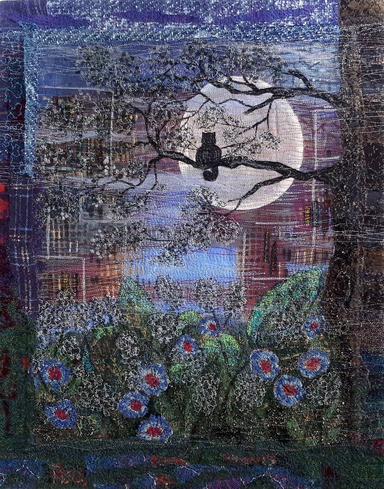 Decorative art quilt for contemporary interior in mixed media technic: acrylic painting, prints on fabric, textile collage + appliqué, felting and free machine embroidery. Suitable for both children's and adult interiors. Stretched in a framing workshop. The sides are also decorated in stitched fab...