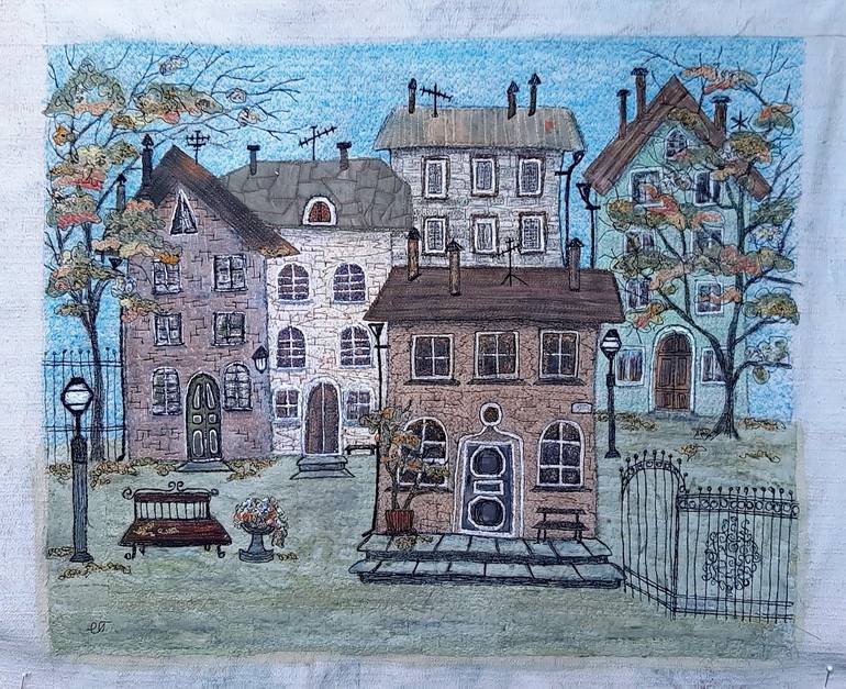 Decorative artwork made of fabric for the interior - a fantasy autumn town in a “naive” style. Mixed media: acrylic paints on fabric, appliques from pieces of hand-dyed fabric, quilting and embroidery.