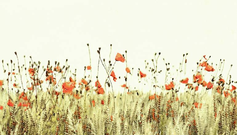 A field of poppies in digital oils in hues of coral orange, sage green and yellow on a canvas texture with a sheer green tint. Based on a photograph. Please visit my Contemporary Florals gallery to see more of my wildflower artwork.