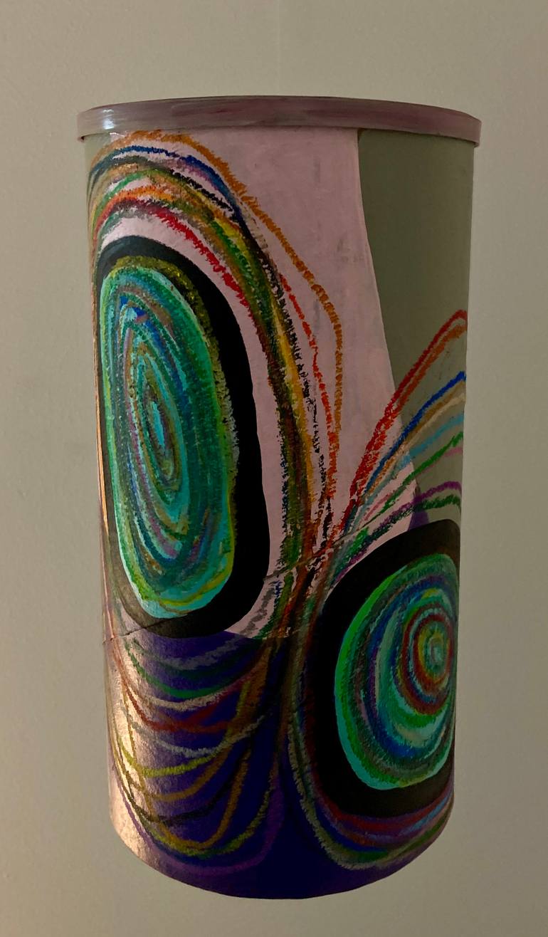 Cy Twombly, Alexander Calder and Phyllida Barlow were artists that inspired me. I want the viewer to see the powerful energy cells floating and moving through space. I chose a cardboard container with a plastic lid because of its lightweight qualities and mobility. Hanging hardare in included.