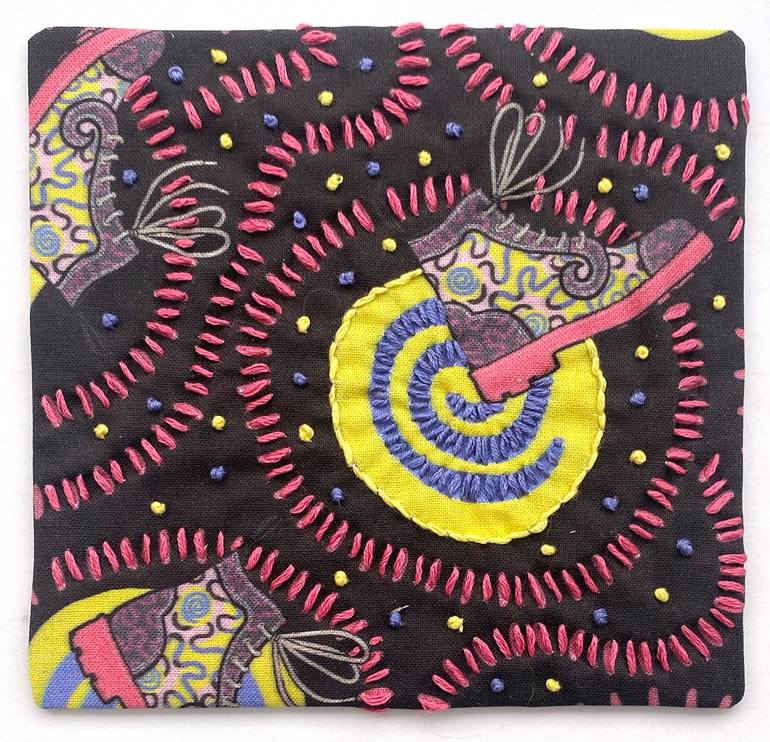 I am a big fan of Fluevog shoes. This style was a collaboration between Fluevog and Zandra Rhodes. I thought it'd be fun to embellish my textile print with hand stitched embroidery. The piece is mounted on thin cardboard and has a plate hanger on the back.