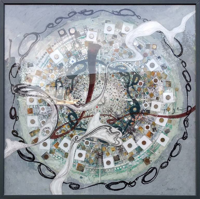 The artwork "Flux & Focus #1" consists of two panels: a larger one measuring 102 cm x 102 cm, and a smaller lower panel of 25 cm x 102 cm. The upper panel depicts a circular map of a stylized city, overlaid with symbols representing investment methods, including authentic coins from various coun...