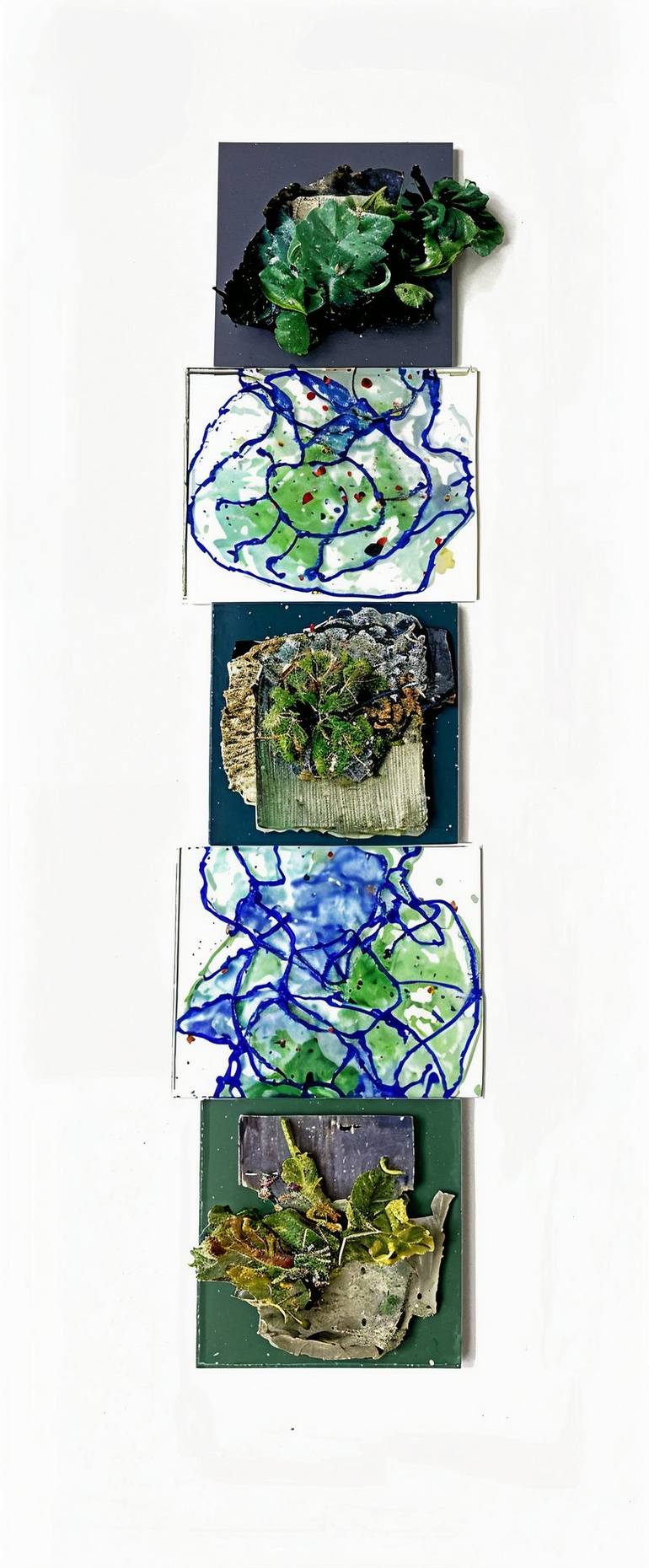 "Forest Canopy Ripples on Blue Water," captures the serene interplay of nature and light. This piece features a delicate fusion of blue-green glass , fibre art and paper that mimics the lush foliage of a forest canopy while providing a sense of depth and texture. The intricate design reflects shimm...
