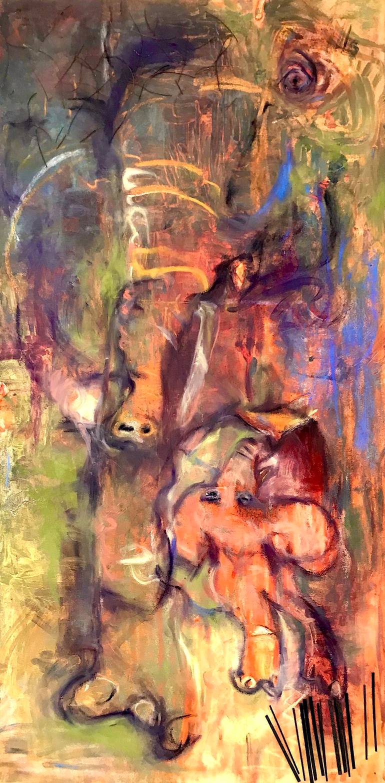 My work is idea and feeling based. It has been compared to the work of Cecily Brown, Oskar Kokoschko, and Hieronymus Bosch. Why make Art: I want to be of use, to be an asset to the bio-world. Produce something that grips the heart, informs the mind. I offer, but don’t try to force anything. I bring things into myself: history, scientific discoveries. Art becomes an affixing of the resolution of these thoughts,. What Kind: People in all guises get lots of coverage from artists. While my life has had rocky times, this is not the world that grips my imagination, rather, the one beyond it. My intuitive connection has been with different beings, somehow possible to connect with on a common experience level. The skein of mentality, of interaction, of seeing into, or inhabiting another creature’s world. The multi-experience of that- imagine how rich! Some have other senses: e.g. bees and birds that can see ultraviolet, octopi with multiple brains, and dogs that can smell Covid19. All of our ways of coming to understand more; AI communication, medical exploration, brain scans, physics that posit multi-verses, vast organisms like the 106 acre Pando Aspen forest: these other ways of experiencing this world. Each creature inhabits a world mediated by its sensitivities… in my exploration I leave the human world a bit, reach for anothers’, try to bring that experience back. Try to affix it. But many life-forms face obliteration. These are existential catastrophes tear at me. I don't shy away from the ways we have brought human things into the dwelling places of other animals, rather gather bits of our debris along with the twigs, dirt, vegetation that bear on the daily experiences of the animal inhabitants. All these become materials affixed to the substrate. These ideas are applied in the specific artworks submitted, further laid forth in each description paragraph.