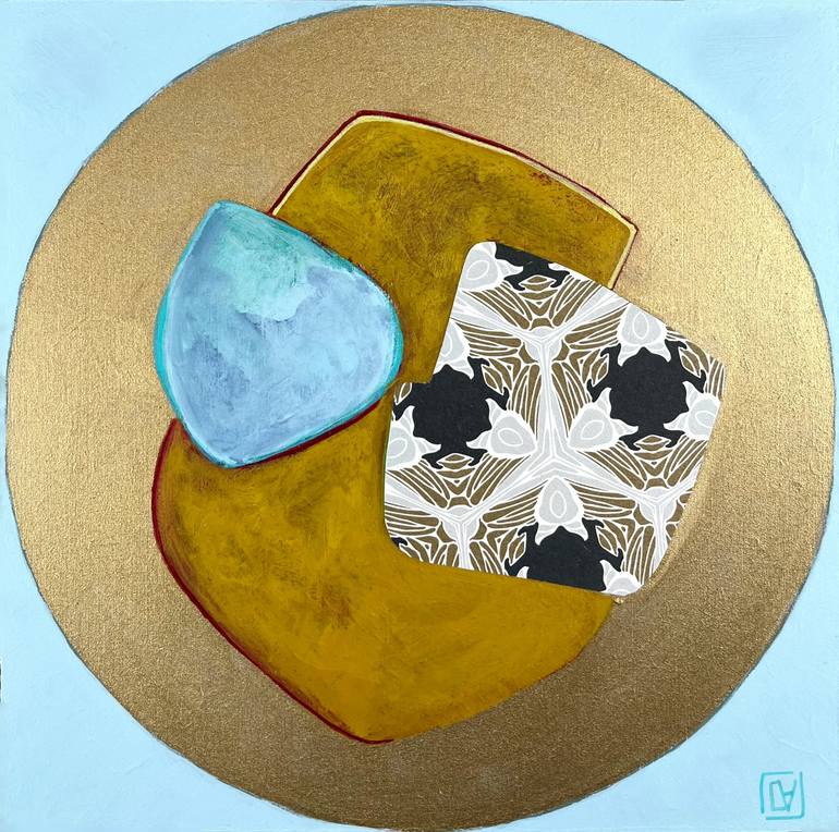 The artist was inspired by the preciousness of ancient icons, particularly their halos, represented here as gilded circles containing abstract compositions. The use of gold imbues the work with a sense of value and timelessness. Incorporating collage with acrylics, ink and gesso, the artist creates...