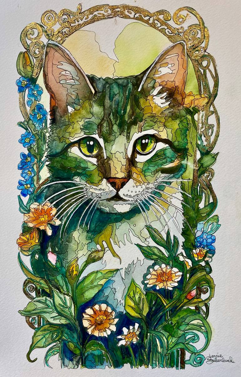 Green Between Flowers – Original Watercolor In this original watercolor, a green cat appears as a whisper of nature – quiet, alert, and surrounded by flowers in warm, soft tones. Her gaze is calm and penetrating, as if she knows something that we will only understand later. A work full of symbolism...
