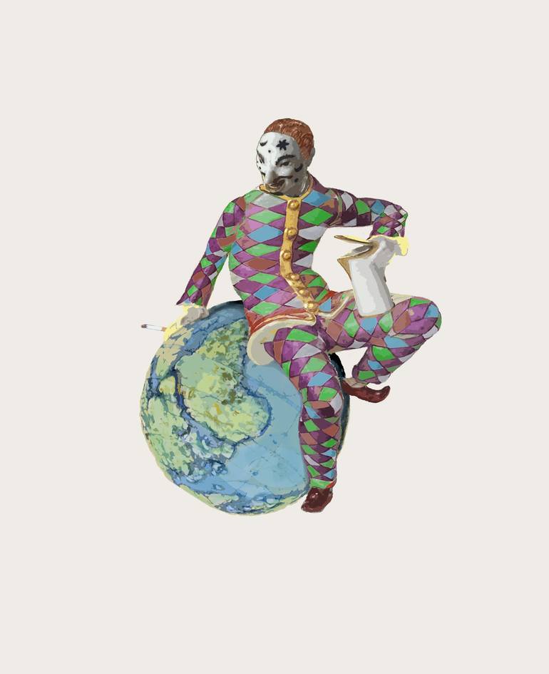 Harlequin on top of the World inspired by the classic porcelain figures of Johann Joachim Kandler.