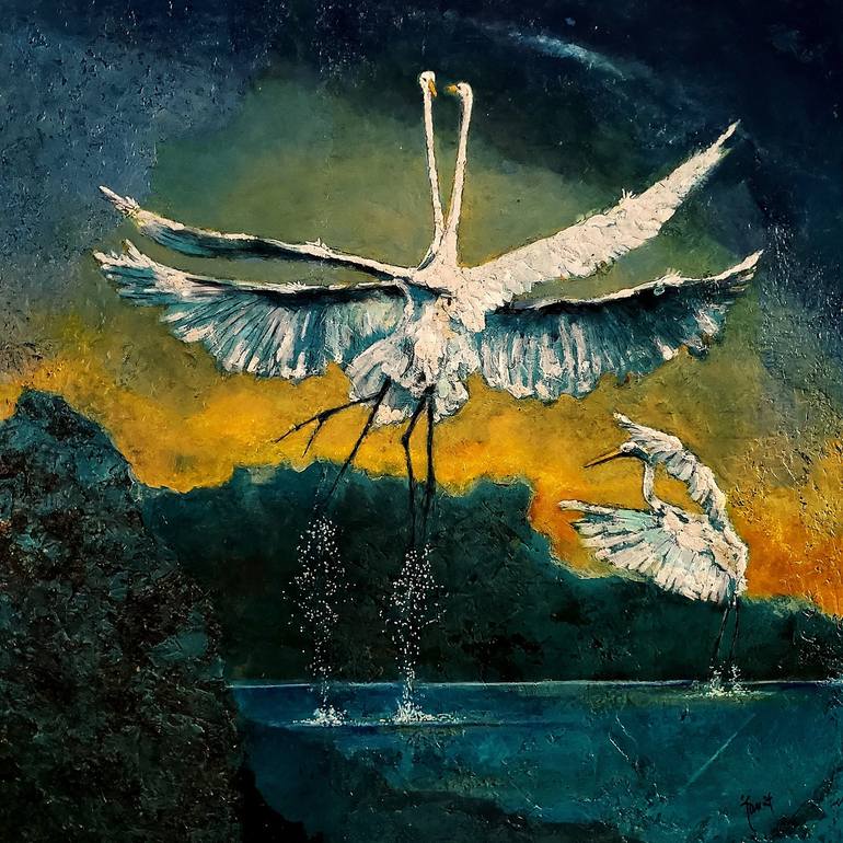 Obers found his inspiration for "Herons" in the serene and often dramatic landscapes of Brazil. The two herons, with their striking white plumage, are not merely birds; they are symbolic figures. The central pair, captured in a dynamic dance with their wings outstretched, represents a sense of harmo...