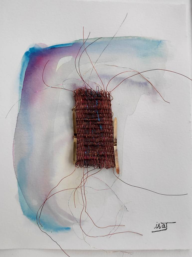 Abstract and poetic artwork born from the encounter between the light of woven metallic threads and watercolour. Two simple materials that speak to each other, associating the natural with the precious, produced by the golden sparkles of the metal according to the light placed on them. The threads o...
