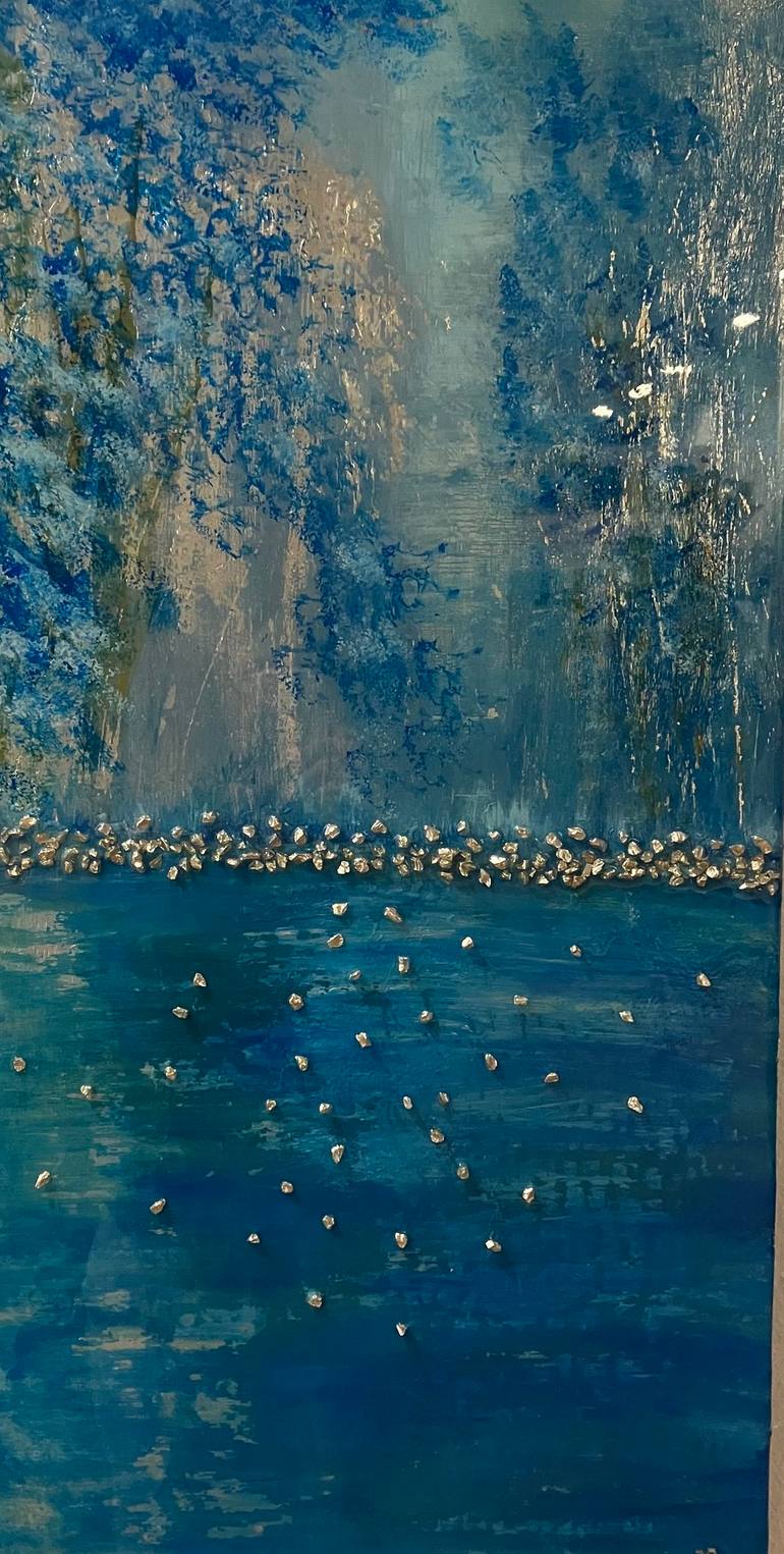 This piece is one of my favorites so I may seem a bit bias in my description. I wanted an abstract forest scene with the hint of a lake through the foliage.i wanted a strong color and shine for movement. I needed a base that shined so I ended up taking unusual articles to achieve that goal.