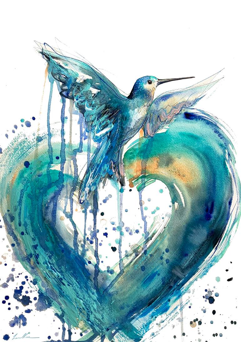 An A3 (27.9cm x 42cm) watercolour and mixed media painting of a blue hummingbird in flight by Sydney artist Leni Kae. The blue hummingbird flies with outstretched wings leaving a colourful heart trail beneath it. Symbolically, the artwork illustrates the freedom that comes from releasing love and pa...