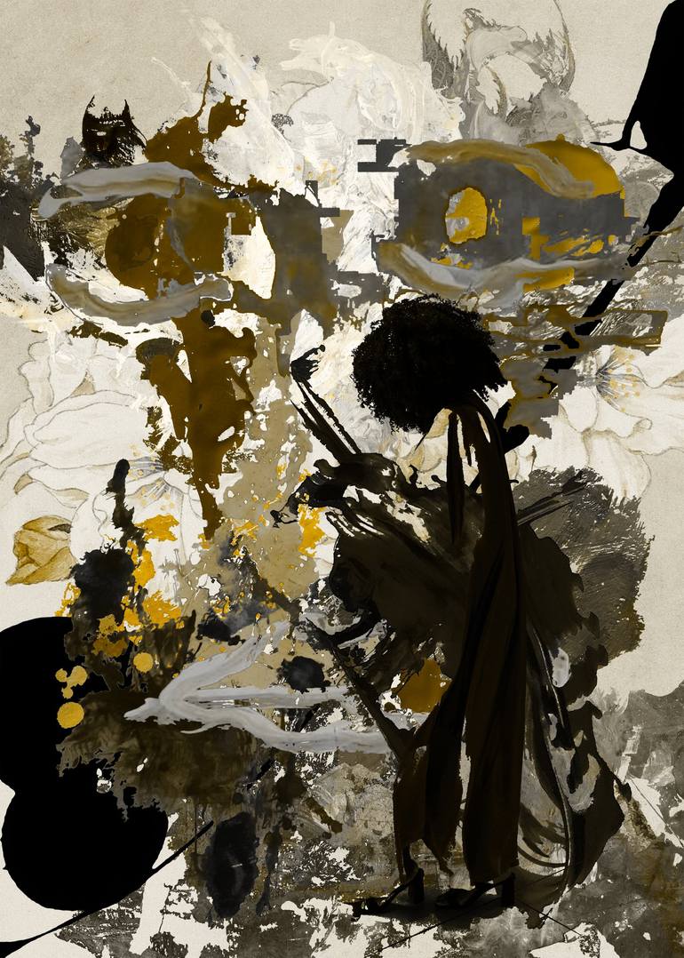 I want to talk about beauty, feelings, life stories, and contradictions—everything that makes us human. The central focus of my creations is the emotions that are omnipresent on this planet, regardless of creed or language; even before we learn to speak, we already demonstrate emotion. I explore not just the 'noble' feelings, but any and all feelings expressed in the contemporary world, amidst the intersections of social media, television, film, and music. Conveying strength, beauty, and everyday life through characters and their clothing, I use abstraction to show that reality is malleable. It may take decades to change, but it is real. The flowers present in all my works—whether featuring a character or a piece of clothing—convey emotions, dreams, and the hope of changing the reality of a community or oneself, recovering one's beauty and self-esteem. My artistic motivation stems from a dream common to every child of my social background: to change our family's situation and give them a better life. In art, I found this opportunity. Initially, I created to deal with my reality and my disillusionment with the academic world. Art called to me; I had to do it, even without fully knowing what I was doing at first. Nowadays, my art deals with emotions by creating images of people who, in Brazil's not-so-distant colonial past, were denied them, producing anguish and pain in their bodies. I recognize myself in an environment that remains largely unchanged—both at the university I attended and when walking down the street—feeling a certain strangeness in places where I still feel I don't fit in. My art is a way of resisting this. Resisting and reclaiming my humanity is what motivates my creation, even though during the colonial period this was stolen from my ancestors: Native Brazilians—the original people of South America—and Africans brought here against their will. My proposal is to work with the emotions of the body marginalized by colonization, creating an image that represents the beauty of these bodies, their contradictions, and their hopes. These are the same bodies described by colonizers as 'savage,' devoid of feelings or emotions. I portray how culture intersects with us and interferes with how we interpret and deal with the emotions that arise. Even if our hopes and dreams are ripped away or manipulated by algorithms, television, or other forms of communication, the emotions that arise are still as present as the dead flowers in my work.