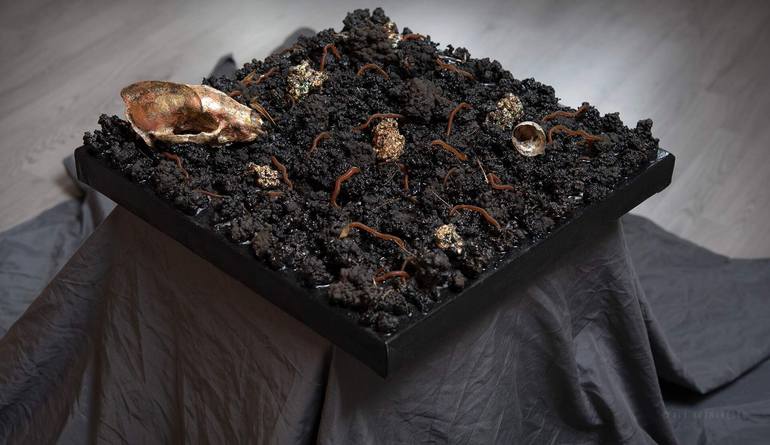 In Motion – Dark Mixed Media Artwork with Real Earth, 40x40 cm Artwork