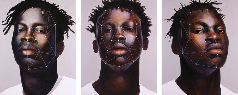 This is a series of 3 paintings of 150 x 120cm each. The paintings were started in acrylics and completed in oils. The final stage was weaving waxed string between pins set into the canvas to show the fractal lines of facial recognition. These faces were chosen for their pride as individuals and not...