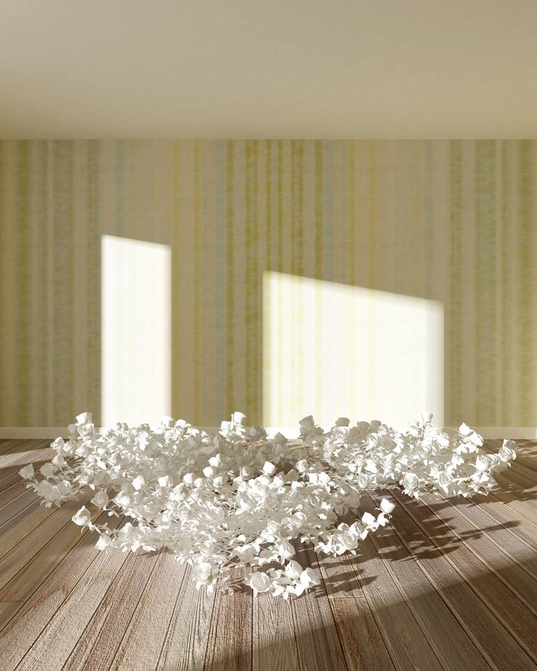 This is an entirely 3D digitally created image, where a surreal environment of vintage walls is engulfed in a flurry of roses which appears to be drawn towards a room holding some strange light force
