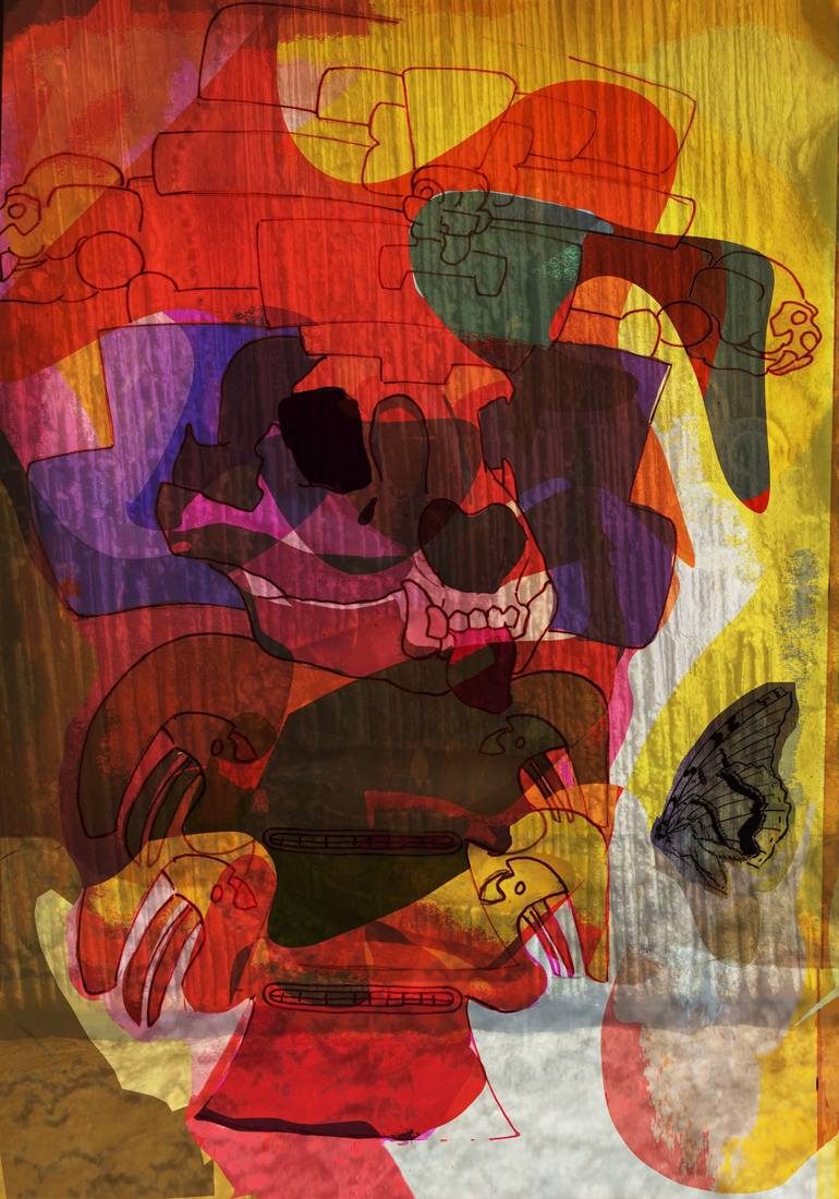 In this work, elements of prehispanic themes and iconography are appropriated, including a ceramic Aztec head piece, and both the Jaguar and the Moth as aspects or messengers of death. Sepia Ink hand drawings in pen and quill, are integrated with photography of metal work on a catholic church door ...