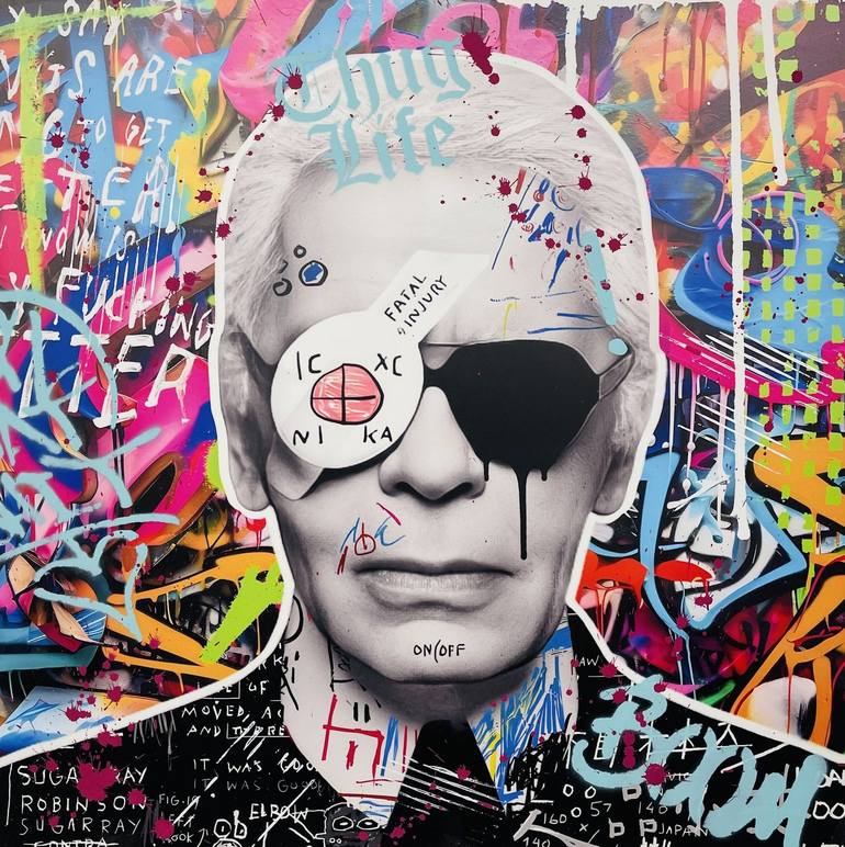 Discover the unique blend of fashion and street art with “Karl Lagerfeld” by AIIROH, a masterpiece that captures Lagerfeld's iconic style through the vibrant lens of AIIROH's street art. This mixed media portrait brings an explosion of color and energy to any space, perfect for the modern art lover ...