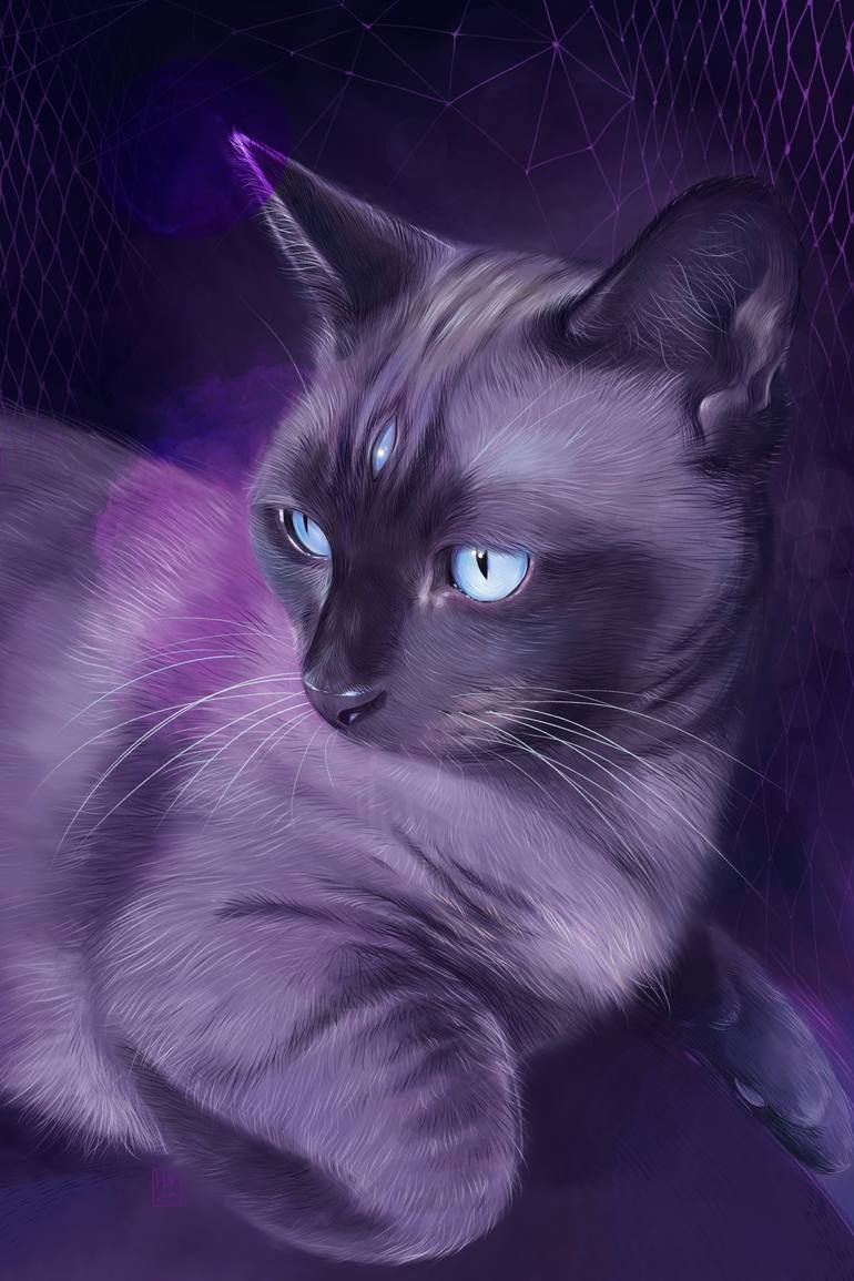 Digital Hand Drawing on Tablet, created with imitation of pencil and watercolor brushes. Portrait of a Сat in violet tones. The artist created a series of conceptual pictures of people and animals, "Violet Storm", united by a symbolic and color concept. An important element of the whole series is ...