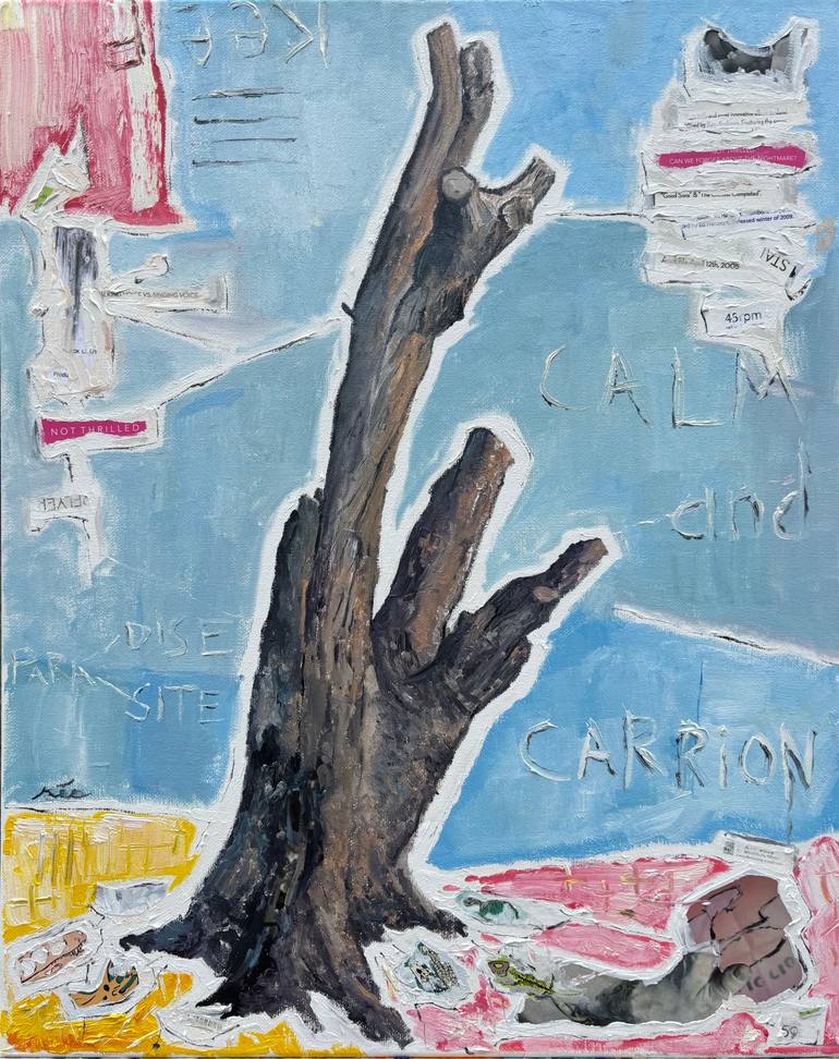 In this painting a stark, weathered tree trunk rises amid a surreal landscape strewn with collage fragments and scrawled text. By the time I had made this painting dead trees had become a favorite subject of mine. When I encounter one in the wild, I always take a picture of it. This particular tree ...