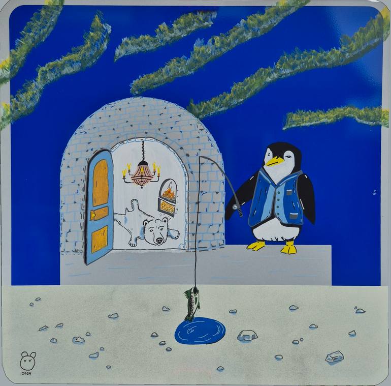 THIS IS THE SIGN! The 'This is the Sign!' series transformed three traffic signs into artworks. 'King of the Igloo' is a parking sign transformed to an artwork of a Penguin and his Igloo. Traffic Sign: Parken - Verkehrsschild VZ 314, RA1, Aluminium Spray Paint: Montana Acrylic: Molotow