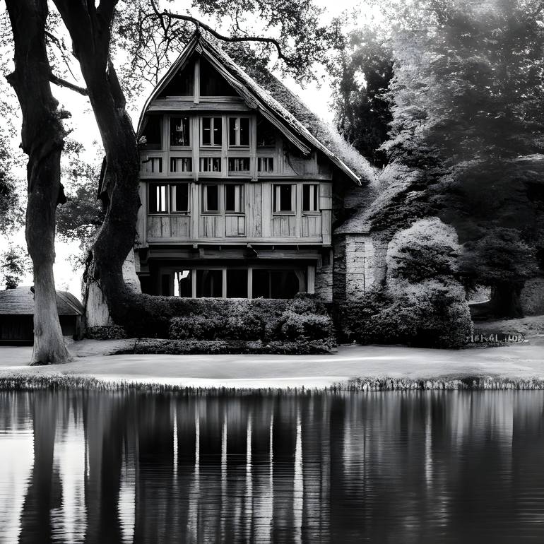 In this captivating black and white image, we are transported back in time to the enchanting era of the medieval period. The scene unfolds with a picturesque lake house, standing proudly amidst the tranquil surroundings. The house, with its aged stone walls and thatched roof, emanates an aura of his...