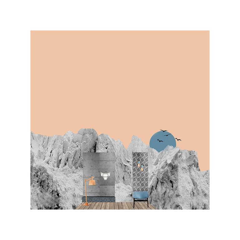 Land (e) scapes suggest the creation of parallel new worlds and spaces inspired by various landscapes. Small interior "oasis" in the middle of nowhere lets the mind escape from reality. Digital collage printed on fine art paper