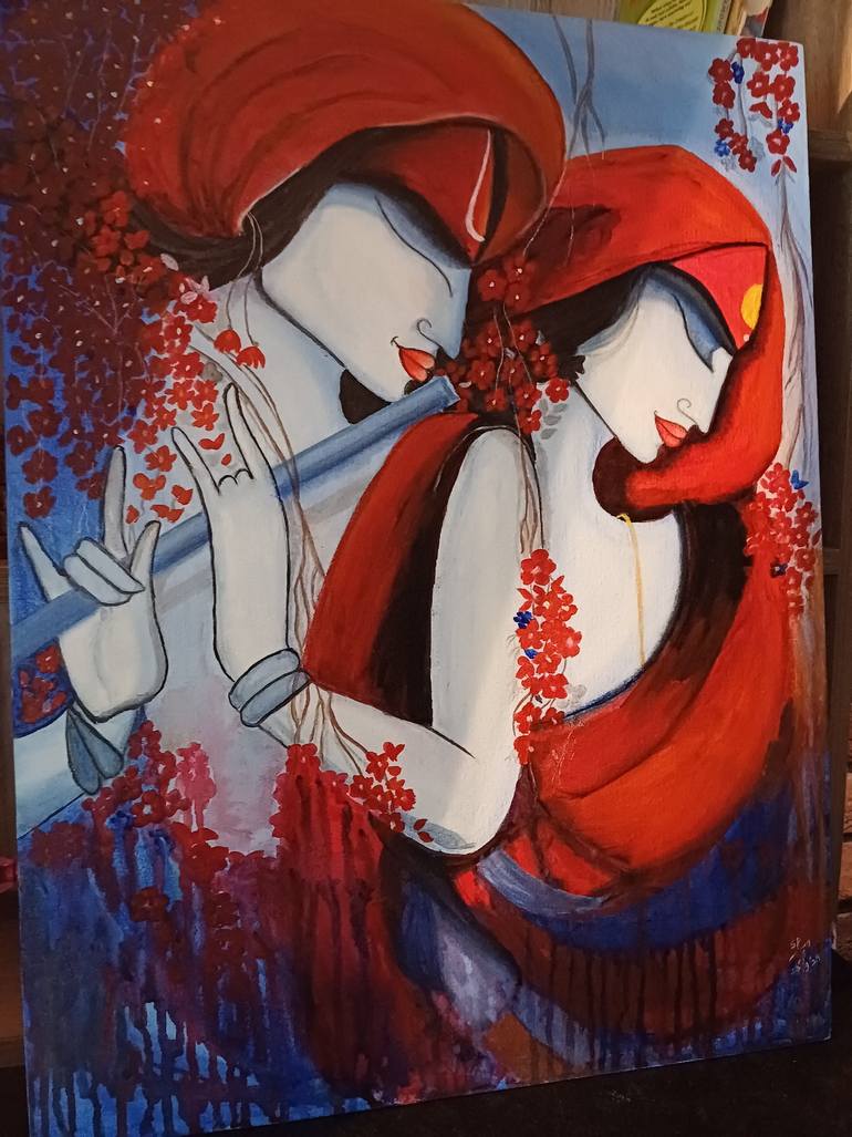My artwork is a reflection of who I am . I am a firm believer in love and positivity and am very proud of my culture and heritage. Who more apt for that subject than Krishna and his beloved Radhe. The bold red and the pale blue just makes the painting stand out anywhere.