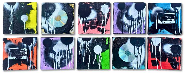 light and sound are two halves of the whole. one is only made richer by the presence of the other. 10 8x8 panels- installed in two rows of 5 with 1 inch spacing measures approx 44x17 acrylic, spray paint, CDs and a Audio tapes on canvas.