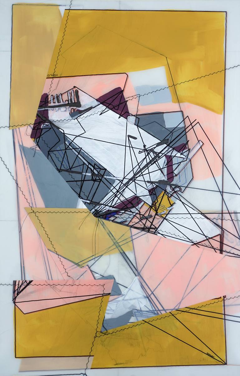 Through the incorporation of stitching as both a structural and aesthetic element, the artwork emphasizes the act of assembly, drawing attention to the deliberate interplay between deconstructed shapes and the unifying presence of the stitching medium. The artwork is painted on translucent acetate p...