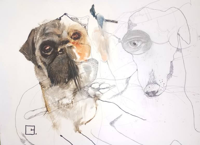 Discover the hint of a face ,the owner merged with the dog behind the spectacle. If you look beyond the dog with the glasses you can see the owner. If you see the owner the dog disappears in the foreground. Trick your eyes : ) Original painting on paper with oil on the left side and pencil drawi...