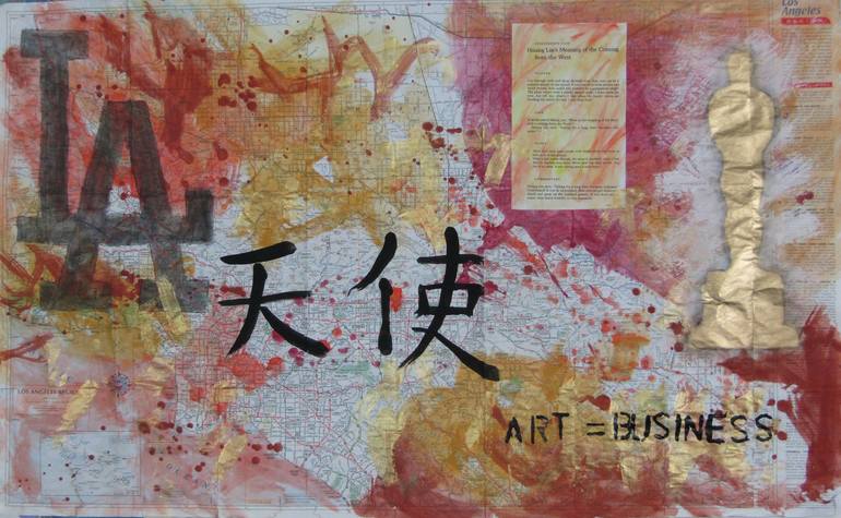 This is an artwork done on a map of the grater Los Angeles area. It explores the mythos, the glamour, the grit, the enigma that is Los Angeles. Dreams, money, glamor, gossip, commercialism all that fuels the machinery of the city of Los Angeles.