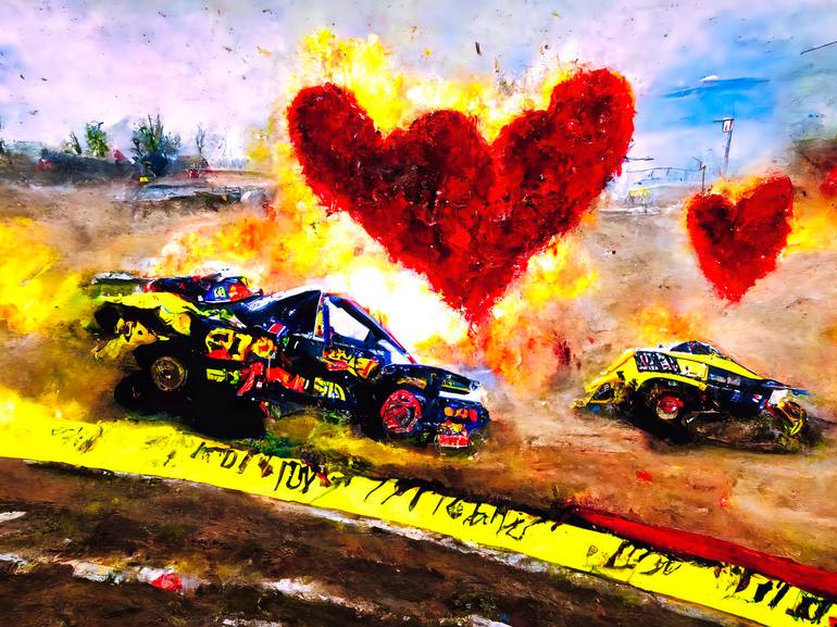 The energy of an outdoor stock car race cannot be described, but this piece captures some of the love of the excitement of seeing two skilled drivers racing. This work was created using artificial intelligence and is a visual poem created by the artist. A 'love tap' is what drivers call a small bump...
