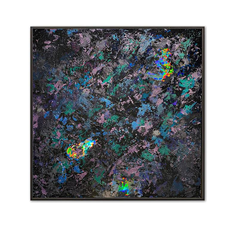 A captivating abstract composition that evokes the mysteries of the cosmos. The interplay of dark tones with iridescent splashes of vibrant colors creates the impression of stardust drifting through a nebula. The holographic highlights appear to shimmer like auroras, adding depth and movement to the...