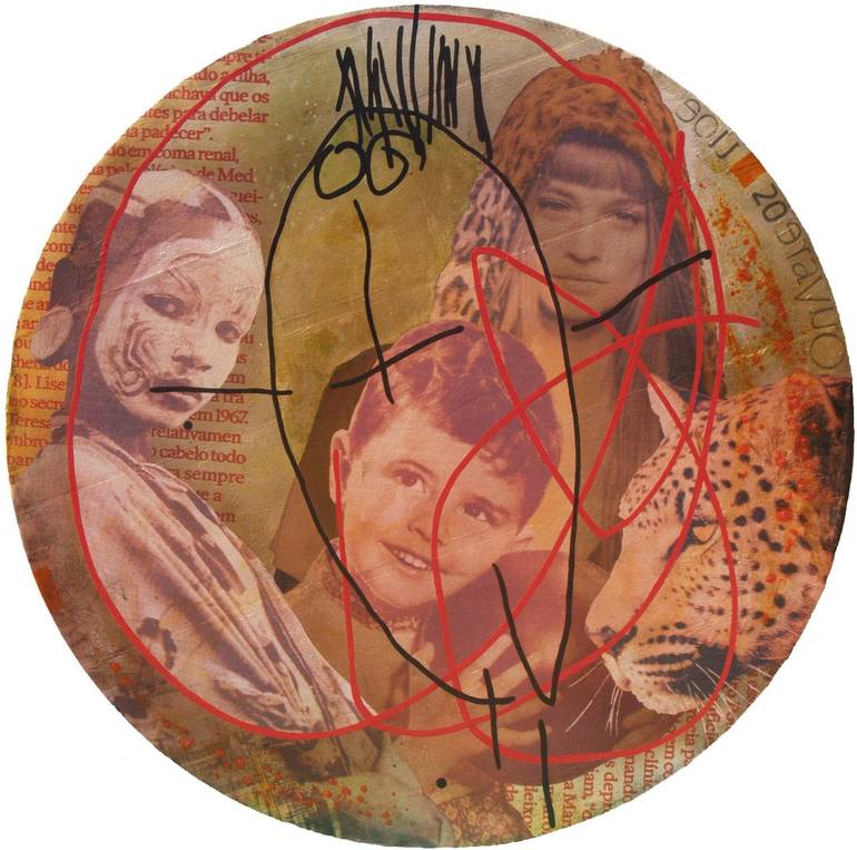 Brief biographical statement: Al.Ma. is a Portuguese artist who was born in MOZAMBIQUE, where she spent her childhood. Actually she lives and works at Porto, in the north of Portugal, divided between teaching and plastic creation. AlMa took her Licentiate Degree in Painting in 1992 at FBAUP (University of Fine Arts of Porto). She has participated in several collective Exhibitions and activities since 1988 in Portugal, Germany, Brazil, France, Spain, Canada, etc., she held several solo exhibitions in Portugal and received some awards and distinctions both in Portugal and abroad. AlMa comes from a generation of artists that has chosen, facing a saturated visual world, the appropriation and recycling of several images from varied sources, for the last twenty, thirty years. Yet, her inclusion in this group is controversial, since instead of the usual method of unconditional stealing of references, historic quotations and the respective recycling giving rise to a scattering of the meaning, her case has been revealing a restricted idiosyncratic orientation. That Alma wants us to be enraptured by this childhood world seems to be, in the very act, her aim. Though it clearly shows, at first sight, a good imitation of the compulsory childish trend to write and paint on inappropriate surfaces, the author’s vandalism, only apparently innocent, goes obviously even farther. In this fluid, transparent and theatrical space, an interaction of mutual influence, either graphic or plastic, reveals itself – between the background pulsation (staging reality) and the overlapped drawings (paradigmatic of the childish imaginary). From this agitation an expressive strength of a nostalgic, metaphysic and a kind of lost time atmosphere appears. About her process the artist says:” I like to play with images and establish tensions, to focus attention from some icons by opposition to others. At the present, I frequently use images like pop stars or very recognized objects in comparison with others less recognized, like typical, regional or tribal ones. Sometimes this context creates a bizarre and an unexpected environment that I intend to catch the observer and lead him to wonder. I broach the subject of playful mood, and use scrawls to demarcate the territory that represents my imagination”.