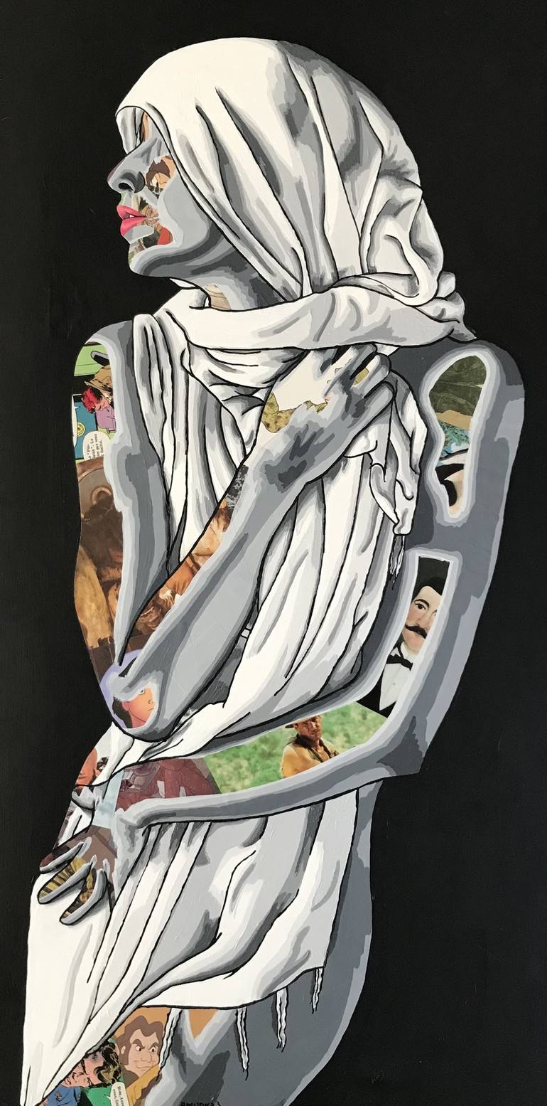 40 x 80 cm, paper and acrylic on handcrafted canvas, 2023 Theorized by Laura Mulvey in 1975, the "male gaze", or "male gaze", is defined first in cinema then in other forms of art as the way in which men appropriate female bodies: camera which lingers on the legs, buttocks, chest, different lightin...