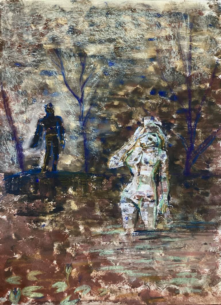 A man walking around the outskirts of a small town saw a woman bathing in the river. This series of works is dedicated to their meeting.
