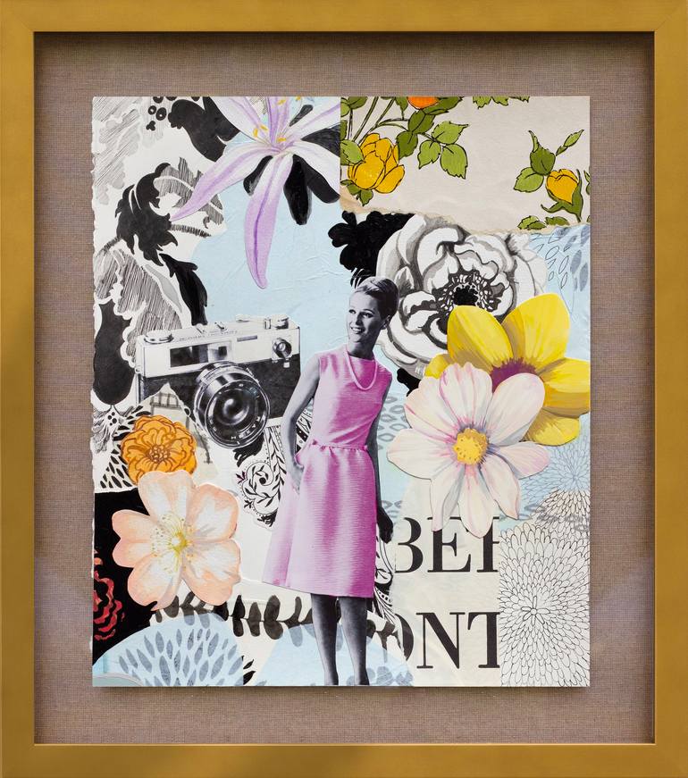 Gouache, ink, vintage wallpaper, vintage ephemera and printed papers collage on fine art watercolor paper. In this vintage chic mixed media collage-painting, hand-drawn ink sketches and scraps of ephemera tell a story as they are layered and adhered onto paper. 1960s woman from my personal collectio...