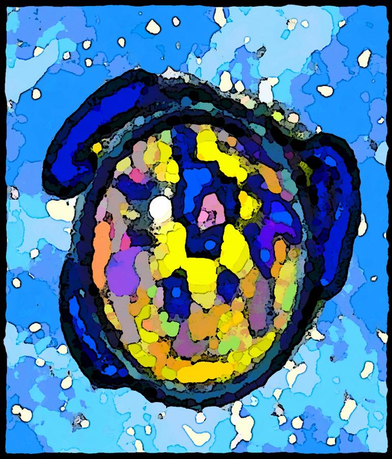 Originaly created on 2003, this piece of art is a microscopic landscape painted with a computer program. It has been used as the cover of a book published later. It represents the eternal life's molecule.