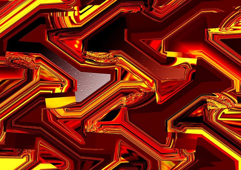 This artwork bursts with vibrant energy, featuring a complex network of interlocking, angular shapes. The dominant hues of fiery red, molten orange, and radiant yellow create a sense of heat and movement, resembling molten lava or electric currents coursing through a maze. The bold, zigzagging lines...