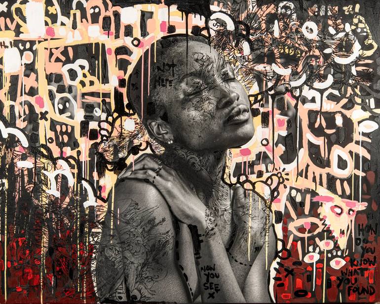 From the tender age of eight, John-Herbert Wright gravitated to painting as an escape, expressing a rich inner world. His work heavily relies upon dark figurations amongst an urban landscape, leaving the viewer space to navigate the world he creates. An analogy of the human condition; centering the female nude/mother and child as the protagonist, he tells the story of the broken seeking respite, the downcast, the Other. Wright seeks to illuminate the universe of darkness within all of us, within himself, and that darkness contrasted with fragility has always been at the epicenter of his work. Wright has managed to create a niche for himself as a painter and street-wear designer, contributing to the role the graphic t-shirt has played in disseminating New York street culture across the globe. Transferring the techniques of garment making onto his canvases, Wright’s paintings feature backdrops of multiple layers of silk-screened images, drawings and text. Although his success has been celebrated, in many ways Wright has also kept his own story on fade. ‘Til now!
